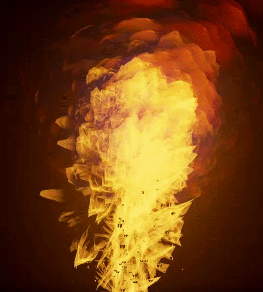 I made this modifying the blackbody particle system in Content Examples/Effects. The initial particle is like a liquid, it carries momentum, falls due to gravity, and doesn’t grow or spread much. Dying spawns a more flame-like particle with Event Generator and Event Receiver modules. It inherits velocity but has high drag. It grows, spreads and cools rapidly, and accelerates upward. A collision event spawns a similar particle that starts hotter, grows, spreads and rises faster.