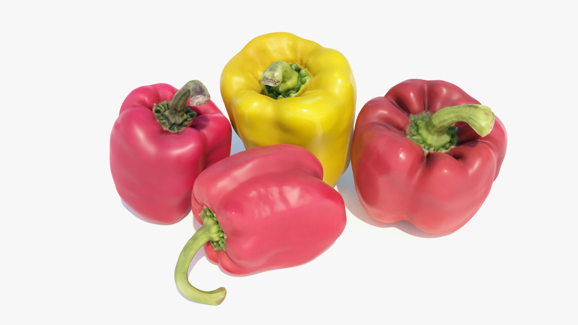 This is a digital 3d model of four Japanese piman (bell peppers). The piman have been scanned and retopologized from four different Japanese variety peppers, and the resulting models have an excellent quality and detail, while maintaining a very small poly count.