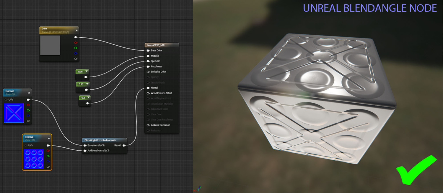 Sometimes you want to use an alpha mask to use more subtle blending. Adding an extra step with the FlattenNormal node before the BlendAngleCorrectedNormals seems to work nicely…
