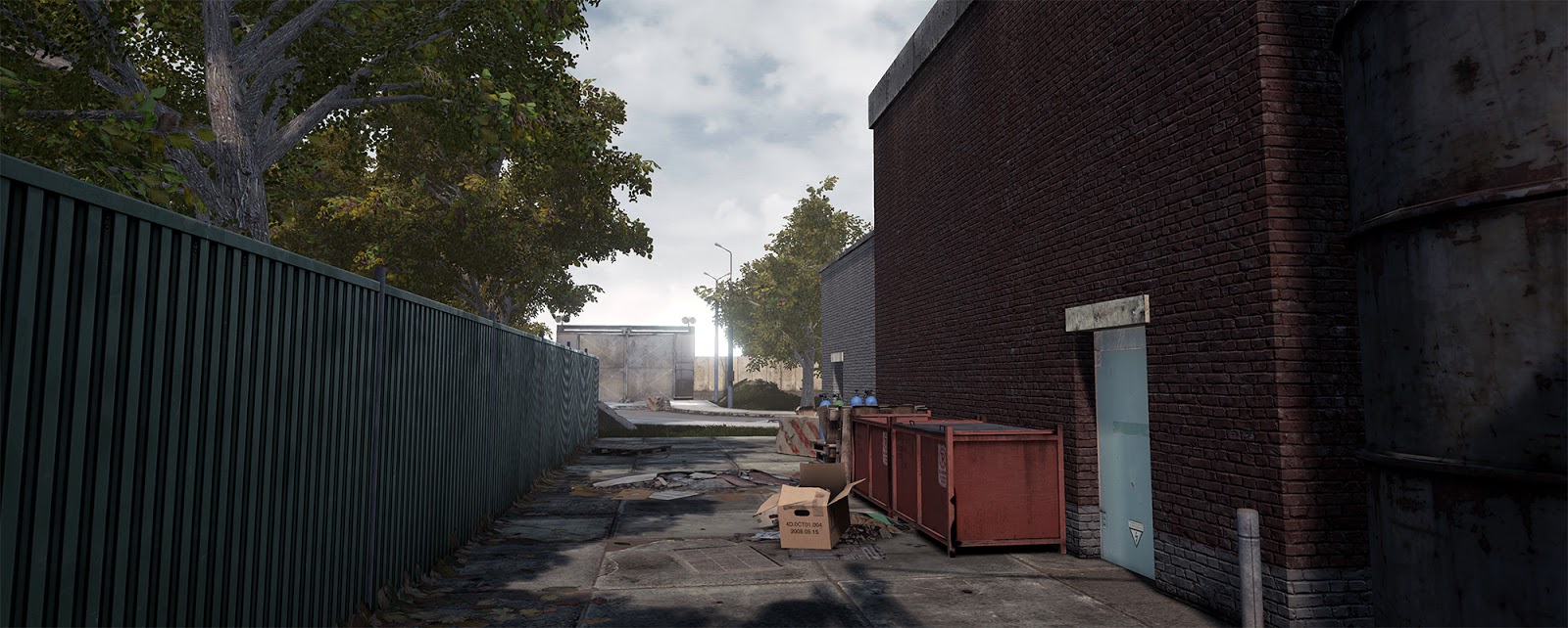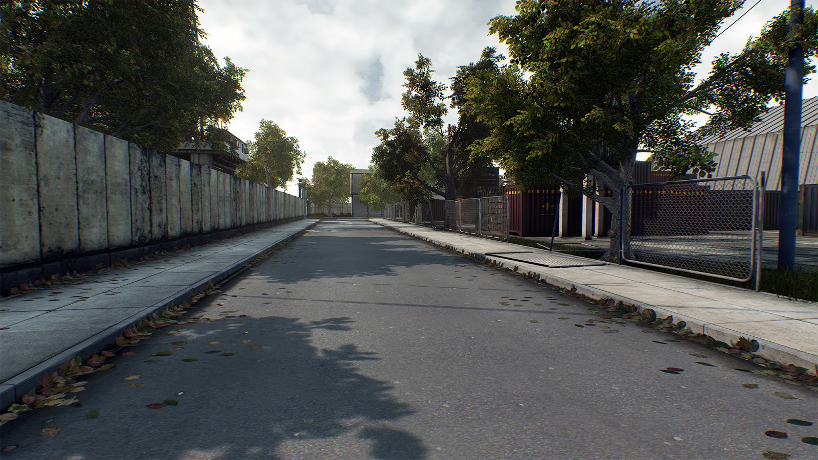 transformer poles, compressed air bottle in different colors, welder, industrial ventilation piping, few metal gates, modular building timber, wooden pallets, antennas for houses, decals of fallen leaves, puddles created with the help of vertex color technology, which you can add to the road, 3 trees of different height, reels with cable, rainwater pipes.