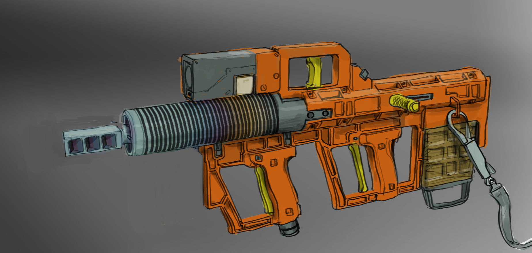 Sketches of the astronaut suit and a rifle for in space. The rifle was really fun to design.