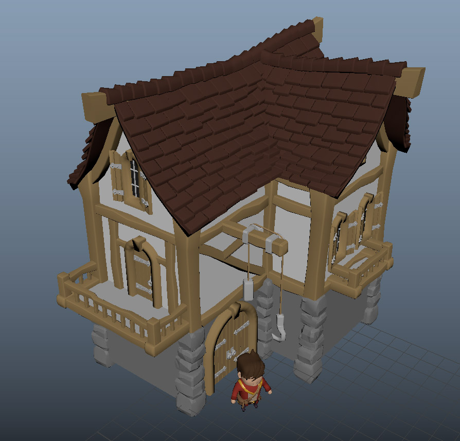 Building kit has been a bear to finish. Its moving forwards, but woohf lot of pieces, lots of UV’s lots of textures to manage… getting there. Now doing high rez bakes for all objects. Doors and Windows done, Roof Tiles done. Stone work to do, and walls to do yet. Here’s a sneak peak at one of the houses as it stands in Maya. New proportions from the old style that matches the character much better I think.
