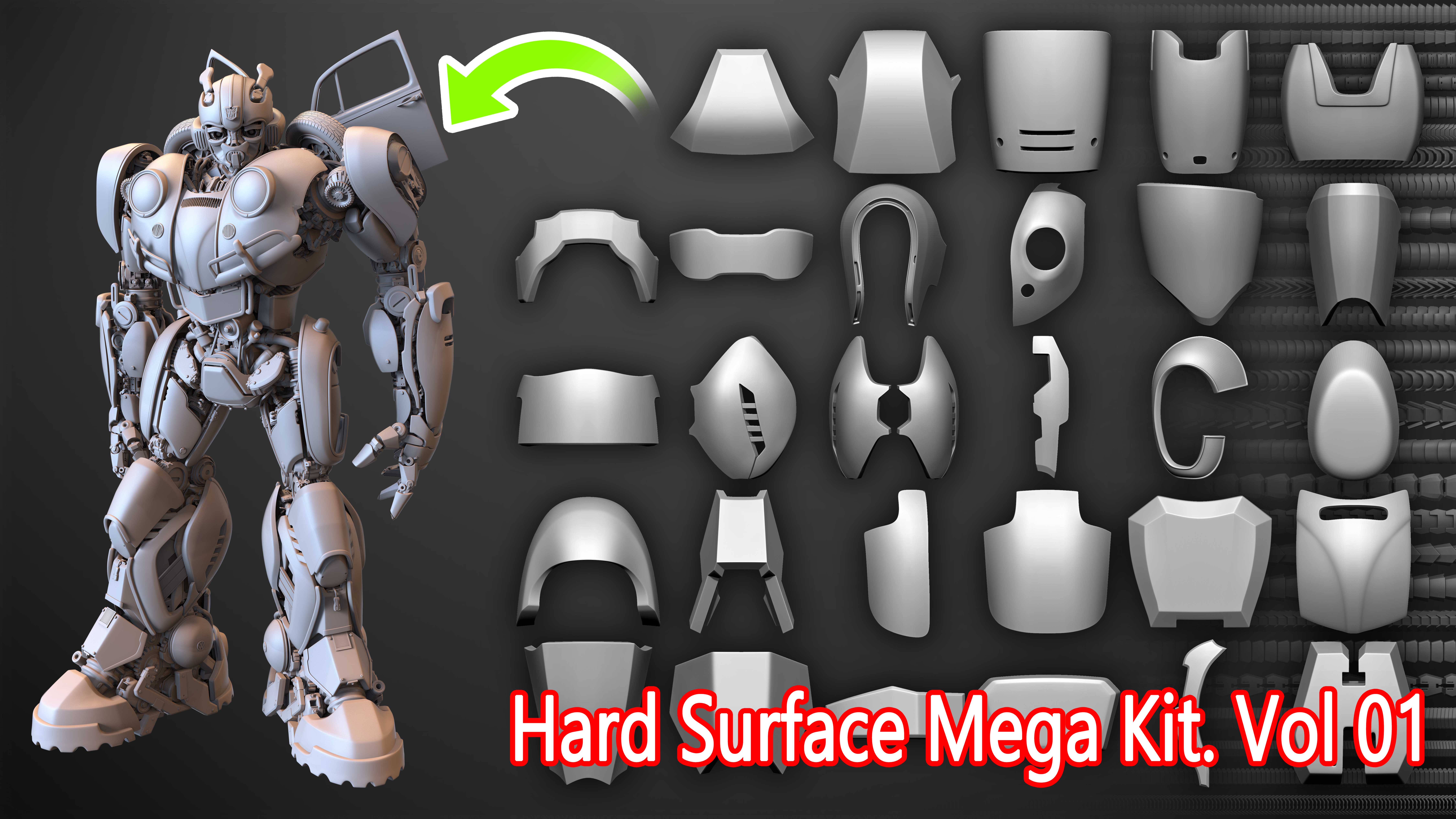I am presenting a Hard Surface Mega Kit, a comprehensive collection of elements and IMM Brushes sculpted to assist artists in hard surface modeling and design across multiple fields. This pack serves as a versatile production toolkit for building robots, vehicles, characters, and mechanical assets, as well as armors, protective suits, clothing elements, and accessories featuring hard surface aesthetics.